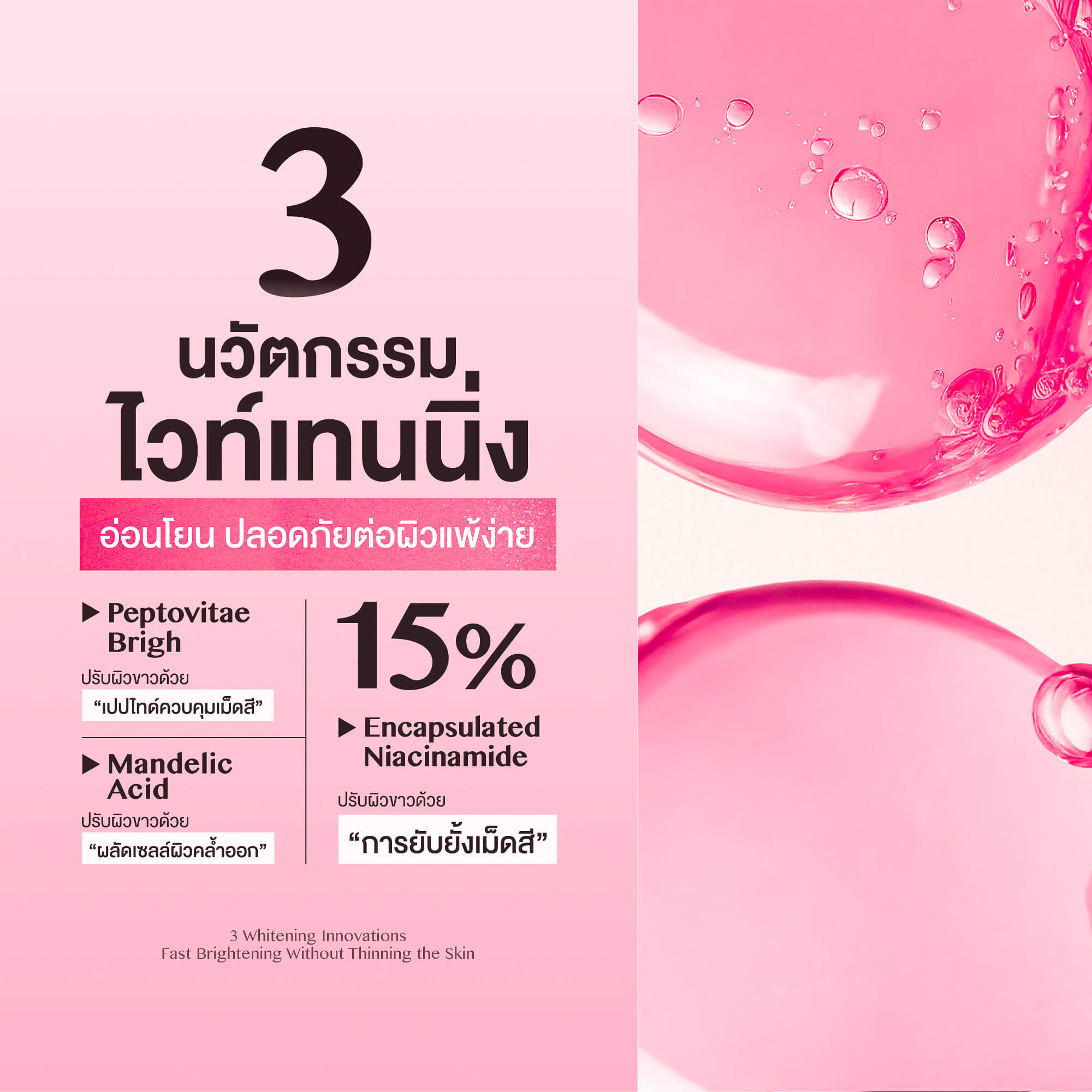 Product Description: Experience the latest concentrated whitening serum formula with three innovative whitening ingredients that are gentle and safe for sensitive skin: Encapsulated Niacinamide 15% for pigmentation inhibition, Peptovitae Bright for pigmentation control, and Mandelic Acid for cell turnover. Featuring a lightweight texture, it penetrates deeply and provides long-lasting nourishment. It instantly locks in moisture for brighter, clearer skin without thinning the skin.
