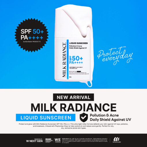 Milk radiance liquid sunscreen SPF50+ PA++++ with Peptovitae Clear innovation that helps reduce acne-causing bacteria, heals acne scars for smooth skin, and is enhanced with UV Filter technology. The latest, protects skin from UVA, UVB, Blue Light and Pollution rays. Lightweight, non-greasy, easy to spread, no white residue. Suitable for sensitive and acne-prone skin.