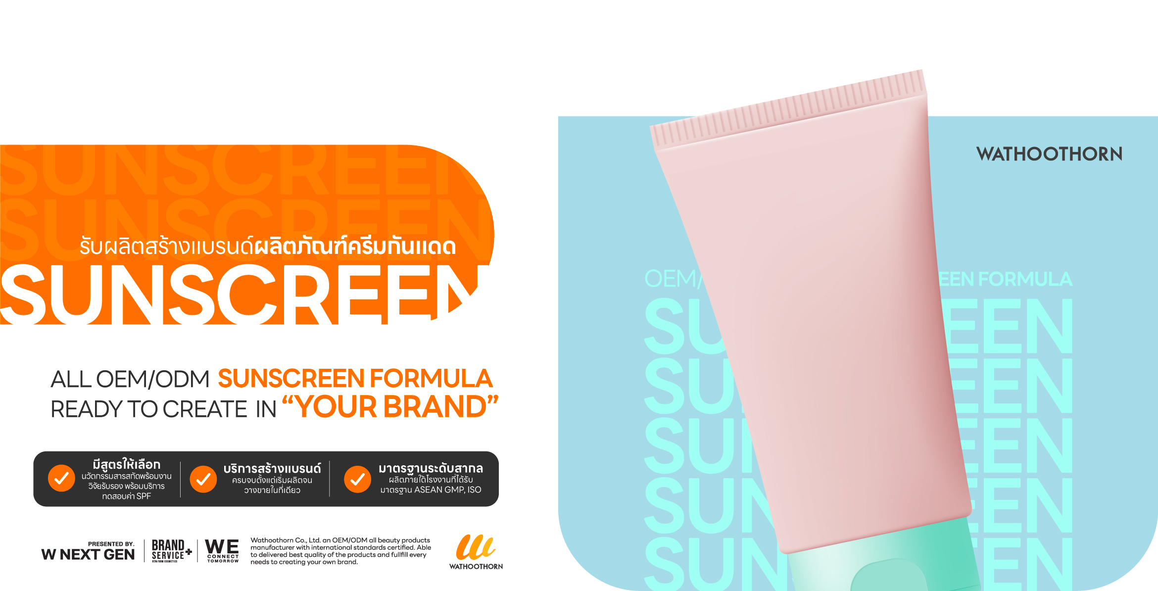 บริษัท วธูธร จำกัด ผู้นำด้านการผลิตครีมกันแดด โรงงานรับผลิตครีมกันแดด OEM รับผลิตครีมกันแดด ในรูปแบบของ โรงงานผลิตครีม ควบคุมและดำเนินการผลิตทุกขั้นตอนภายใต้มาตรฐานสากล บริการสร้างแบรนด์ครบวงจร เลือกได้ทั้งสูตรที่คิดค้นวิจัยแล้ว พร้อมผลทดสอบและงานวิจัยรับรอง พร้อมผลิตในแบรนด์คุณ และสูตรผลิตภัณฑ์กันแดด ที่คุณสามารถร่วมออกแบบสูตร ตามความต้องการ สามารถเลือกเนื้อสัมผัส เลือกสี และเลือกกลิ่นที่แตกต่างกัน รวมถึงกำหนดค่า SPF ที่ต้องการได้ ลิขสิทธิ์สูตรเฉพาะแบรนด์ของคุณ นวัตกรรมสารสกัดล่าสุด ทั้งในไทย และนำเข้าจากต่างประเทศ และบริการส่งตรวจค่า SPF พร้อม CERTIFICATED และผลทดสอบ และงานวิจัยรับรอง